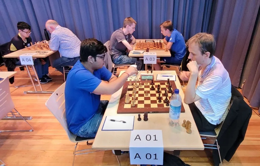 Wie eng es an der Spitze der GRuppe A zuging, konnte man vor der 7. Runde erkennen: Alle Spieler hatten bereits Punkte liegen gelassen, so dass nun 4 Spieler mit 5 Punkten an der Spitze lagen, gefolgt von 3 Spielern mit 4,5 Punkten in Lauerstellung. Dabei kam es zum Traumfinale Setzlistenerster gegen Setzlistenzweiter, also der aufstrebende und ambitionierte 18jährige Inder FM Arun Kataria gegen den mehrfachen Deutschen Dähnepokalsieger und ehemaligen Deutschen Meister GM Hagen Poetsch. Die Partie wurde live auf Lichess übertragen. Für alle diejenigen, die das versäumt haben (oder selber spielen mussten) hier die Notation aus Lichess.
