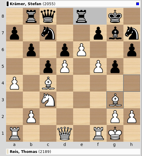 Thomas hatte mit weiß an Brett 2 einen Benoni auf dem Brett in dem sein Gegner kein Gegenspiel organisieren konnte. Die massive weiße Dominanz im Zentrum entschied dann schließlich schon kurz nach dem 20. Zug die Partie. Die Schlussstellung in der der Gegner aufgab: