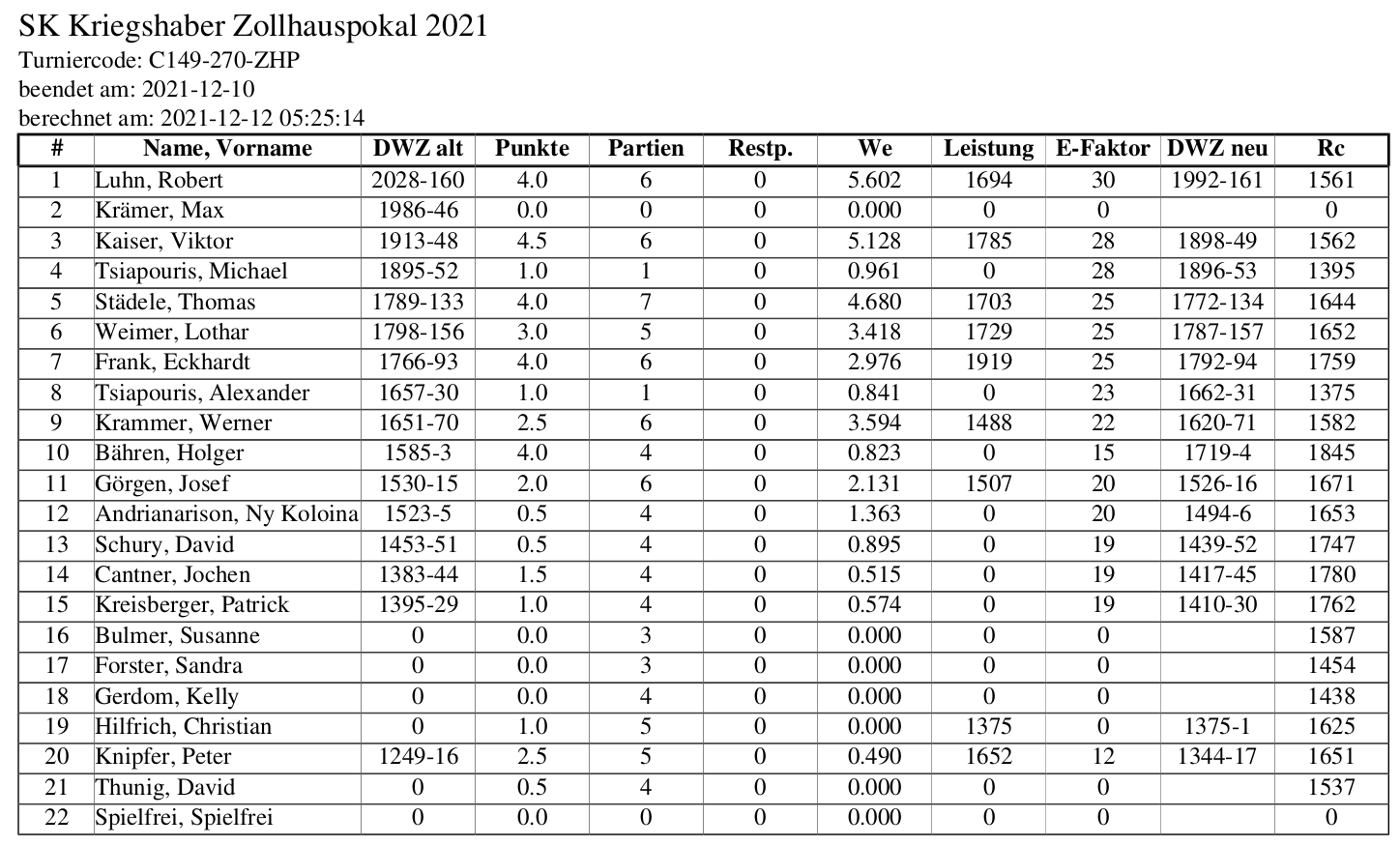 Zollhauspokal 2021 – offizielle DWZ-Auswertungvon SKK12 Dezember, 20213 November, 2025Zollhauspokal ZHP2021-Auswertung Autor dieser Meldung: Lothar Weimer Vorheriger BeitragDienstags-Training am 14.12.2021Nächster BeitragMatthias Reimann gewinnt den Goldenen Weihnachtsmann