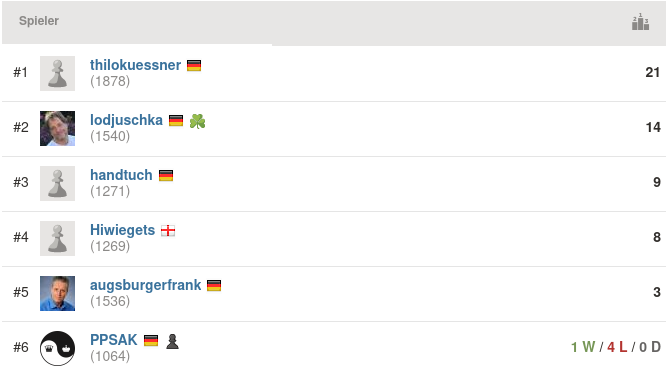 Mittwochsblitz vom 11.08.2021von SKK11 August, 20213 November, 2025MonatsblitzThilo siegt erneut mit 6 aus 6 2021-08-11_ Mittwochsblitz_Endstand Autor dieser Meldung: Lothar Weimer Vorheriger BeitragOne World League LIVE Sommer-Meisterschaft 2021Nächster BeitragMittwochsblitz vom 18.08.2021