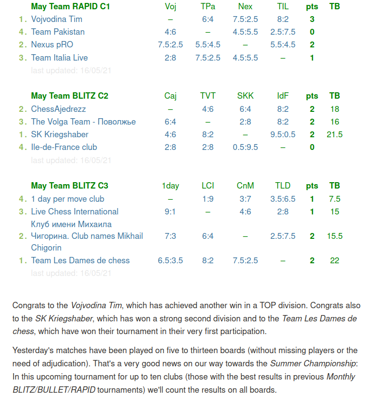 Nach der Blitzrunde Anfang Mai hatten die Pariser gepostet: „Leider haben wir alle unsere Matches verloren; das war der erste Schock, seit wir uns für diese Liga angemeldet haben, aber wir haben keinen Grund, den Mut aufzugeben. Samstag 5.Juni wird wieder zur selben Zeit Blitz und Bullet gespielt. Am 12. Mai ist dann Schnellschach, spielt zahlreich mit.“
