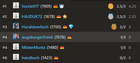 Langsam wird es etwas traurig: 6 Teilnehmer fanden sich bereit, das RAPID mitzuspielen. Nur zur Erinnerung: unser SK Kriegshaber auf Chess.com hat 70 Mitglieder! Es wäre halt schön, wenn wir es schaffen würden, während des Lockdowns so etwas wie einen regelmäßigen Klubabend auf Chess.Com abzuhalten. Das würde auch das Engagement unseres Spielleiters Lothar würdigen, der alles in seiner Macht stehende tut um ein Vereinsleben aufrecht zu erhalten.
