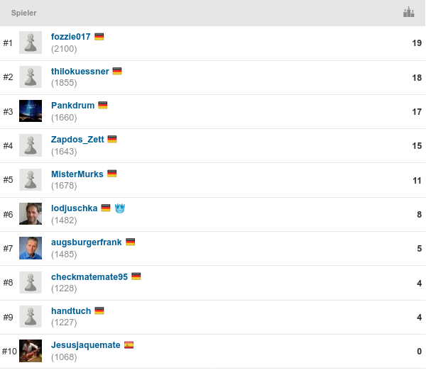 Mittwochsblitz vom 03.06.2020von SKK3 Juni, 20203 November, 2025Monatsblitz 2020-06-03_Mittwochsblitz_Endstand Autor dieser Meldung: Lothar Weimer Vorheriger BeitragClubs League Division A – und noch einmal: Jenseits von AfrikaNächster BeitragSKK-Rapid No. 10: Christoph marschiert mit 5 aus 5 durch